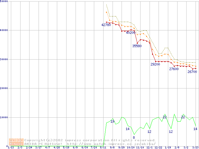 Socket 370 (FC-PGA2,FSB 133MHz,L2 512KB)の最安値推移