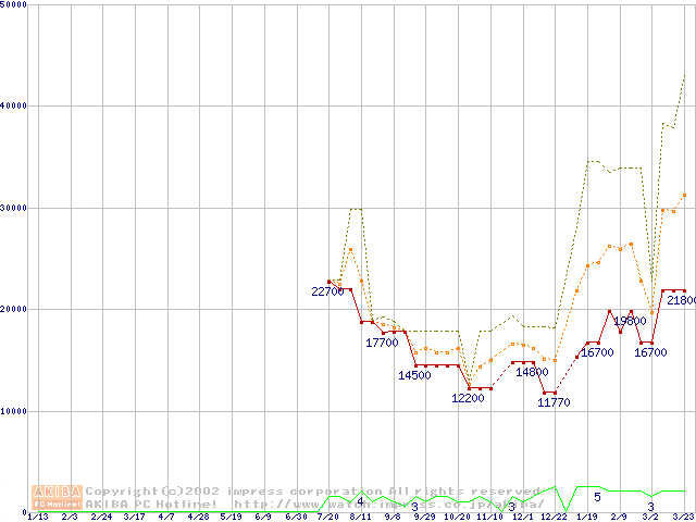 PC100 SDRAM DIMM CasLatency=2 ECC対応 Registeredタイプの最安値推移
