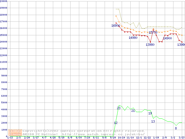 Socket A (Palomino,OPGA,FSB 266MHz,L2 256KB)の最安値推移