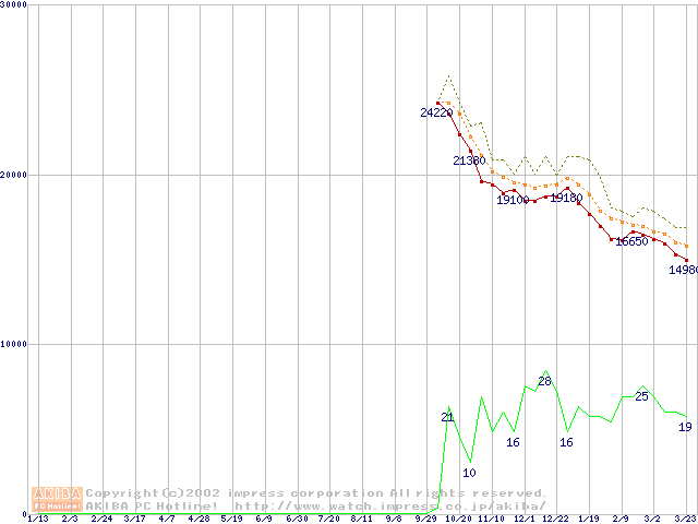 Socket A (Palomino,OPGA,FSB 266MHz,L2 256KB)の最安値推移