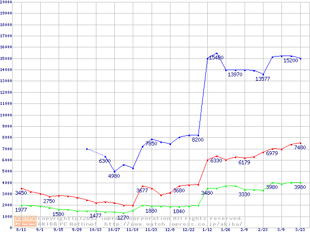 | [↑前グラフ]: | PC133 SDRAM DIMM CasLatency=3の最安値推移 |