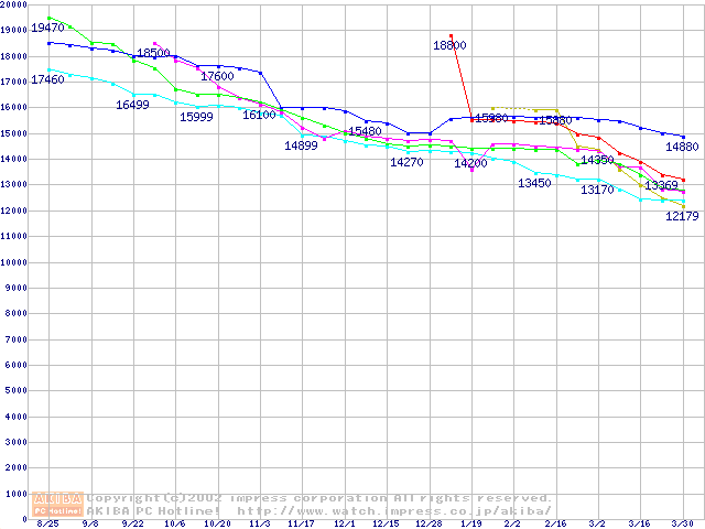 | [↑前グラフ]: | HDD 40GB~50GB未満(7200rpmクラス)の最安値推移 |
