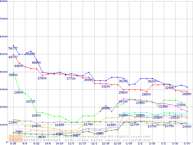 メモリ主要製品(最安値1万円以上)の最安値推移