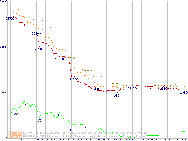 Socket A (Thunderbird,PGA,FSB 200MHz,L2 256KB)の最安値推移