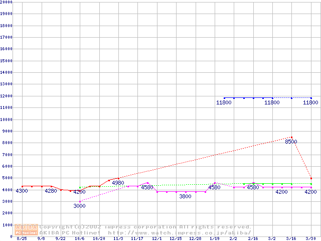 | [↑前グラフ]: | Socket A (Spitfire,PGA,FSB 200MHz,L2 64KB,1.4V)の最安値推移 |
