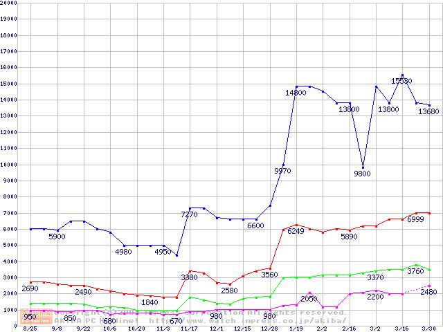 | [↑前グラフ]: | PC133 SDRAM DIMM CasLatency=3 ECC対応 Registeredタイプの最安値推移 |