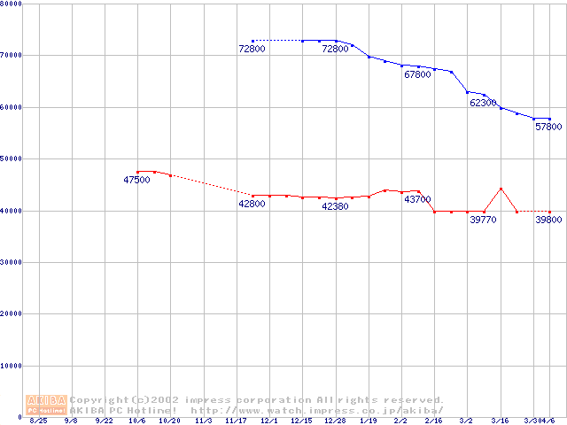 | 2.5インチHDD主要製品(最安値3万円以上)の最安値推移 |