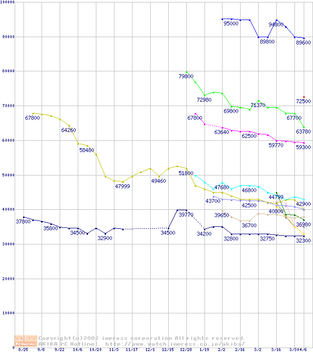 CPU主要製品(最安値3万円以上)の最安値推移