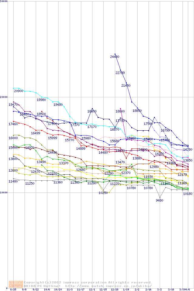 HDD主要製品(最安値1万5千円~2万円未満)の最安値推移