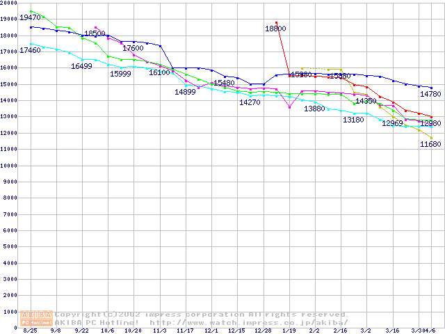 | [↑前グラフ]: | HDD 40GB~50GB未満(7200rpmクラス)の最安値推移 |