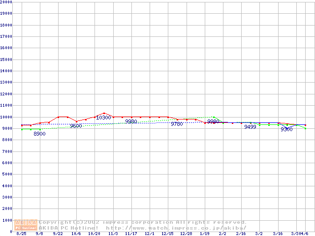 | [↑前グラフ]: | HDD 20GB~30GB未満(5400rpmクラス)の最安値推移 |