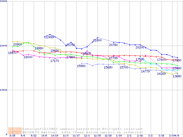 | [↓次グラフ]: | HDD 100GB以上(5400rpmクラス)の最安値推移 |