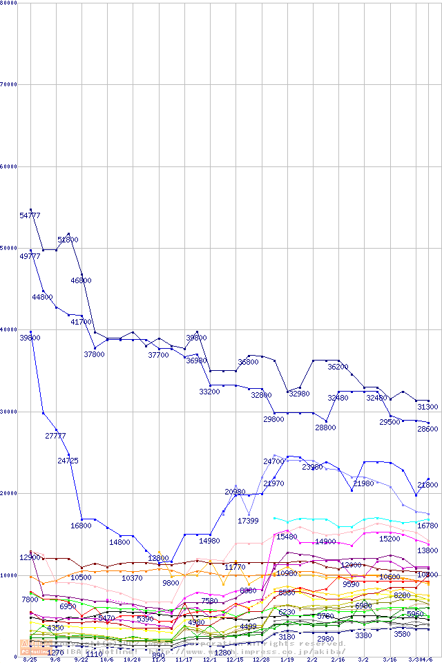 メモリ主要製品(最安値1万円以上)の最安値推移