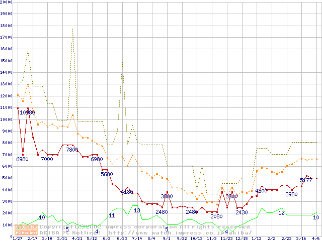 PC133 SDRAM DIMM CasLatency=3 ECC対応の最安値推移