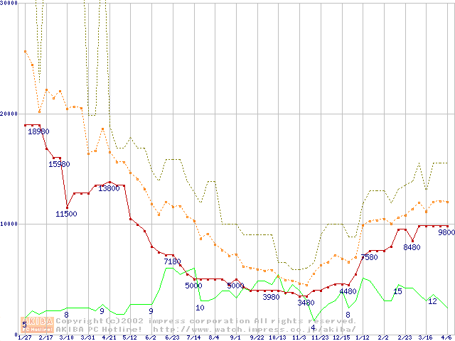 PC133 SDRAM DIMM CasLatency=3 ECC対応の最安値推移