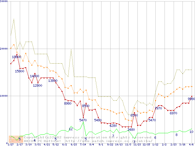 PC100 SDRAM DIMM CasLatency=2 ECC対応の最安値推移