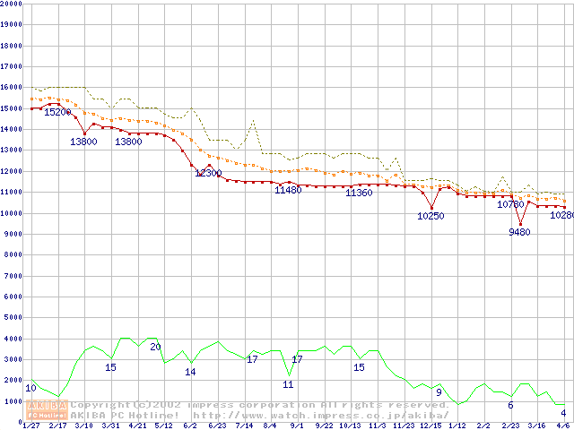 WD Caviar (7200rpm,UltraATA/100,20GB/Platter)の最安値推移