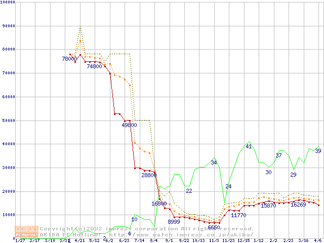 メモリ主要製品(最安値1万円以上)の最安値推移