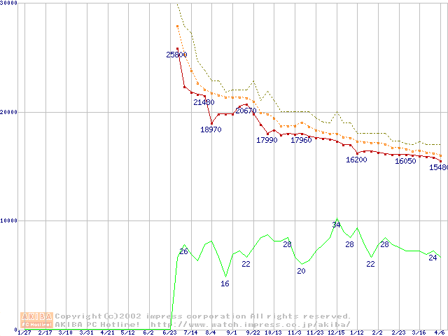 HDD主要製品(最安値1万5千円~2万円未満)の最安値推移
