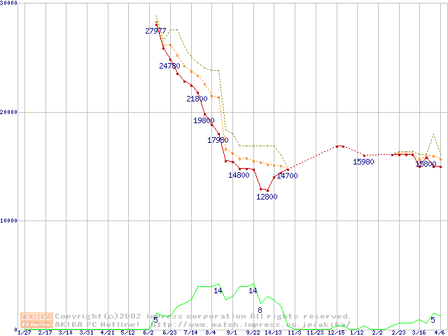 Socket A (Thunderbird,PGA,FSB 200MHz,L2 256KB)の最安値推移