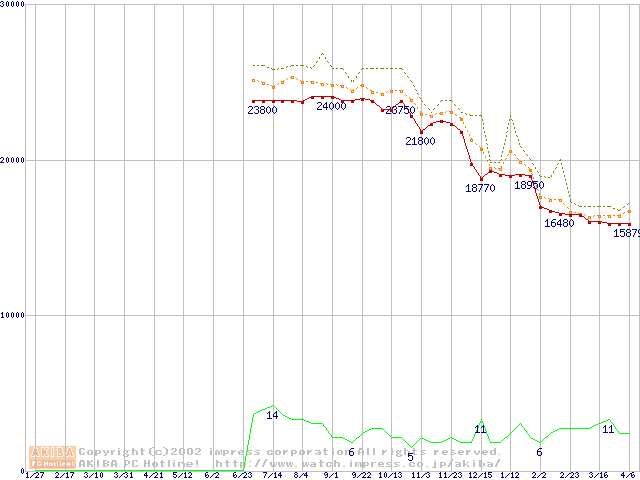 Socket 370 (FC-PGA2,FSB 133MHz,L2 256KB)の最安値推移