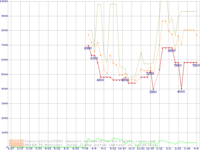 PC100 SDRAM DIMM CasLatency=2 ECC対応 Registeredタイプの最安値推移