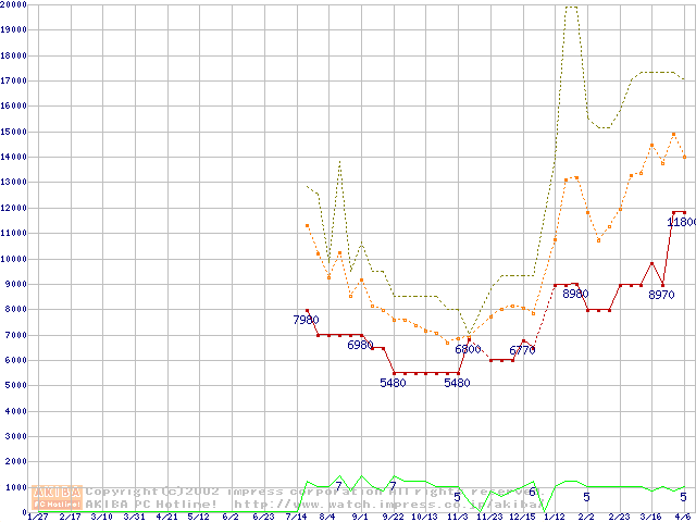 PC100 SDRAM DIMM CasLatency=2 ECC対応 Registeredタイプの最安値推移