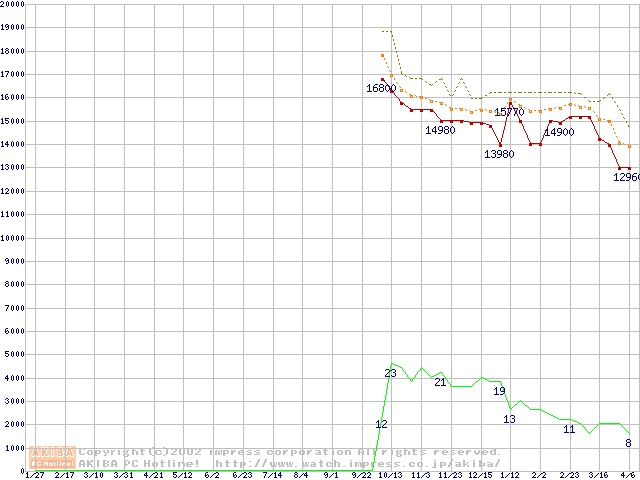 Socket A (Palomino,OPGA,FSB 266MHz,L2 256KB)の最安値推移