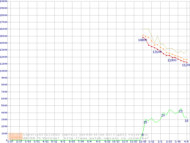 Travelstar 40GN (9.5mm,4200rpm,UltraATA/100,20GB/Platter,2MB,流体軸受)の最安値推移