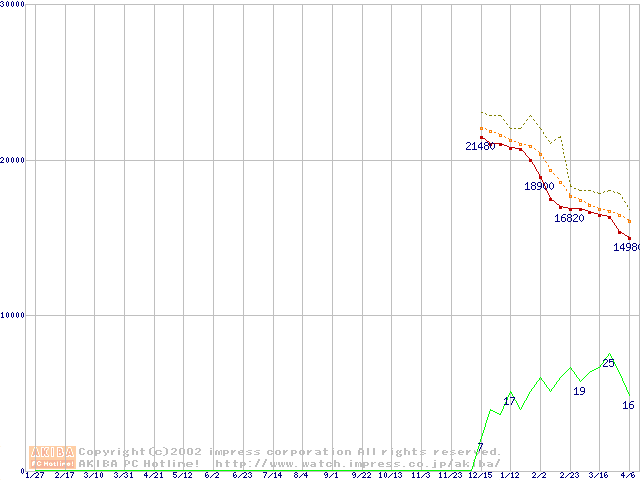 Travelstar 40GN (9.5mm,4200rpm,UltraATA/100,20GB/Platter,2MB,流体軸受)の最安値推移