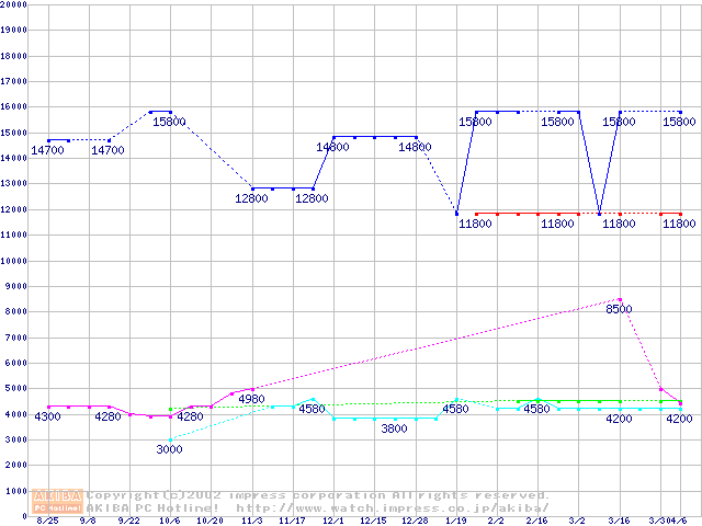 | [↑前グラフ]: | Socket A (Spitfire,PGA,FSB 200MHz,L2 64KB,1.4V)の最安値推移 |