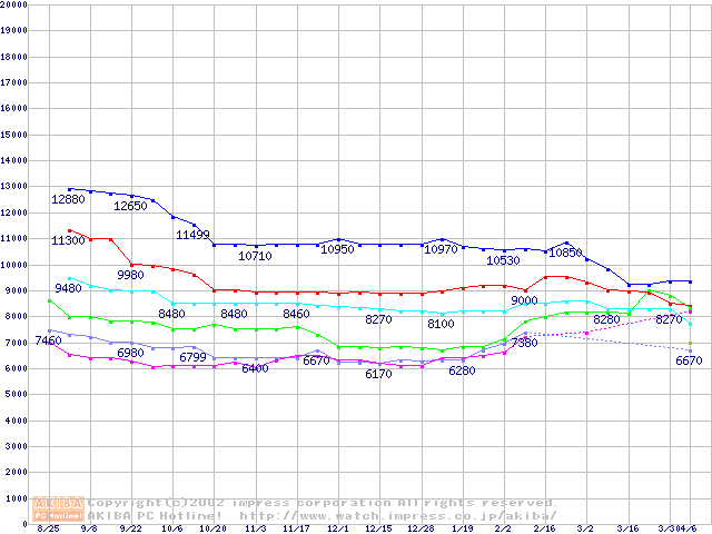 | [↑前グラフ]: | Socket 370 (FC-PGA2,FSB 100MHz,L2 256KB)の最安値推移 |