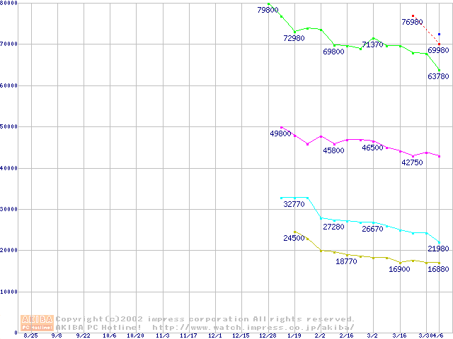 | [↑前グラフ]: | PC800 DRDRAM RIMM ECC対応の最安値推移 |