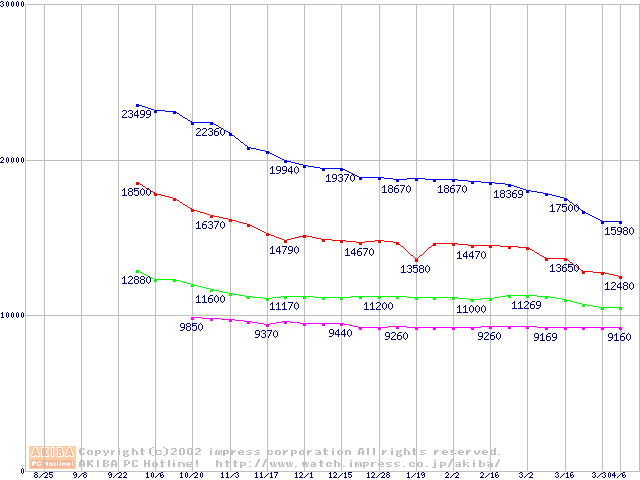 | [↓次グラフ]: | DiamondMax D540X (5400rpm,UltraATA/133,40GB/Platter)の最安値推移 |