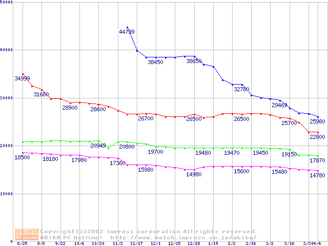 | [↓次グラフ]: | WD Caviar (7200rpm,UltraATA/100,20GB/Platter)の最安値推移 |