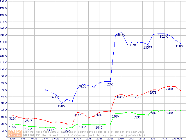 | [↑前グラフ]: | PC133 SDRAM DIMM CasLatency=3の最安値推移 |