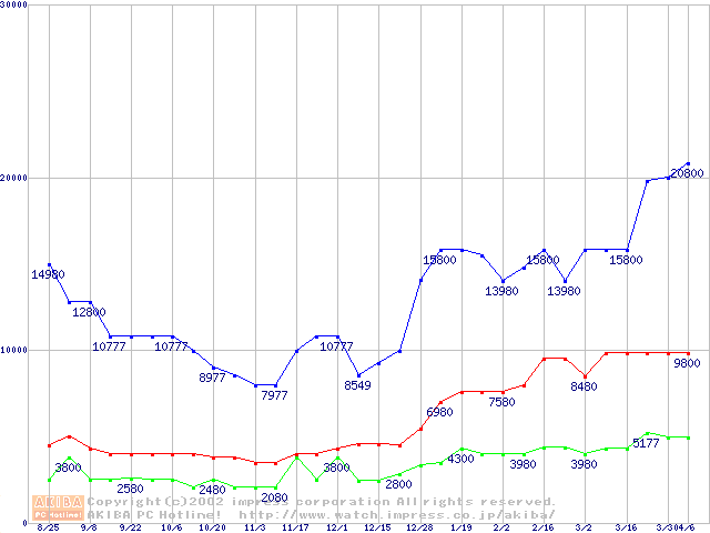 | [↑前グラフ]: | PC133 SDRAM DIMM CasLatency=2の最安値推移 |