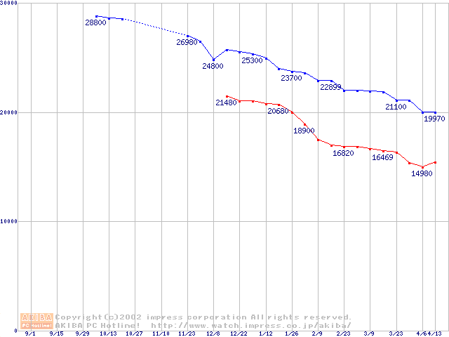 | [↓次グラフ]: | 2.5インチHDD主要製品(最安値2万円~3万円未満)の最安値推移 |