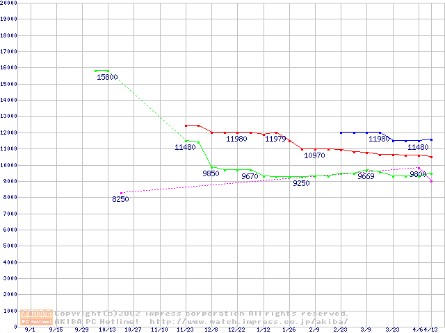 | [↑前グラフ]: | 2.5インチHDD 10GB未満(9.5mm厚)の最安値推移 |
