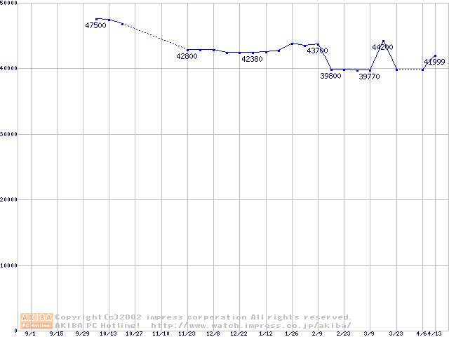 | [↑前グラフ]: | 2.5インチHDD 40GB~50GB未満(9.5mm厚)の最安値推移 |