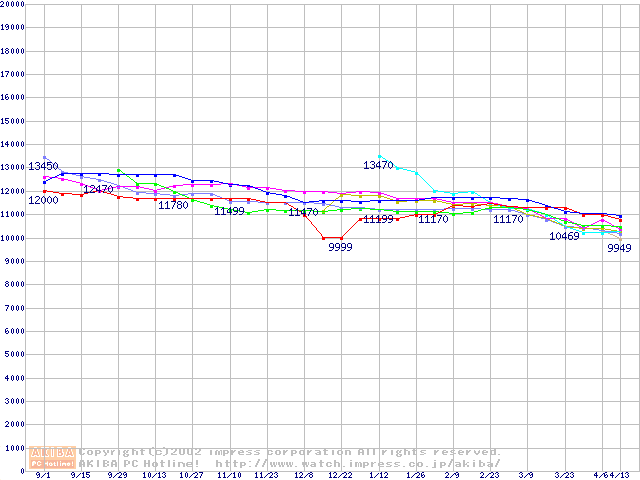 | [↑前グラフ]: | HDD 30GB~40GB未満(7200rpmクラス)の最安値推移 |