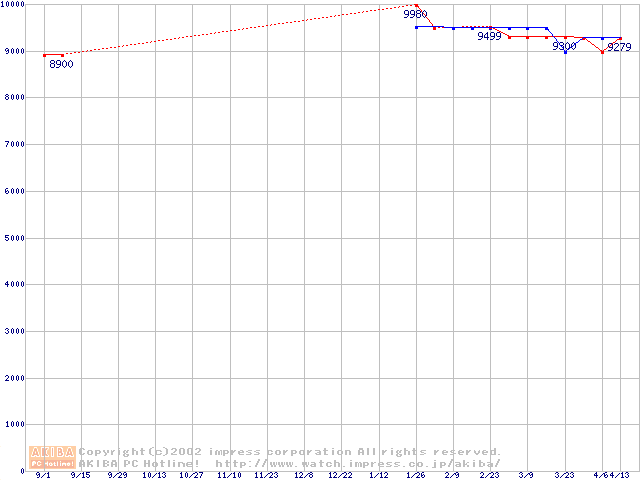 | [↑前グラフ]: | HDD 20GB~30GB未満(5400rpmクラス)の最安値推移 |
