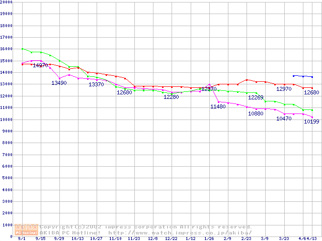 | [↑前グラフ]: | HDD 40GB~50GB未満(5400rpmクラス)の最安値推移 |