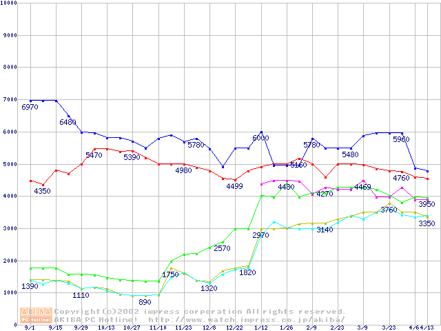 メモリ主要製品(最安値5千円~1万円未満)の最安値推移
