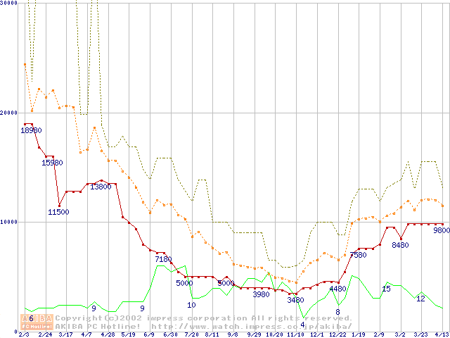 PC133 SDRAM DIMM CasLatency=3 ECC対応の最安値推移