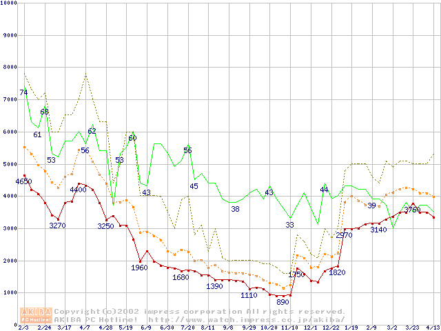 メモリ主要製品の最安値推移