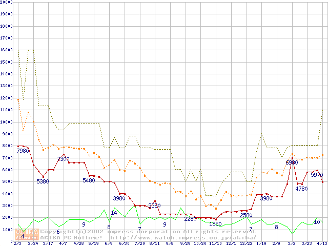 PC100 SDRAM DIMM CasLatency=2 ECC対応の最安値推移