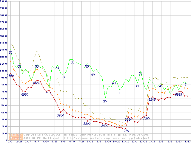 PC100 SDRAM DIMM CasLatency=2の最安値推移