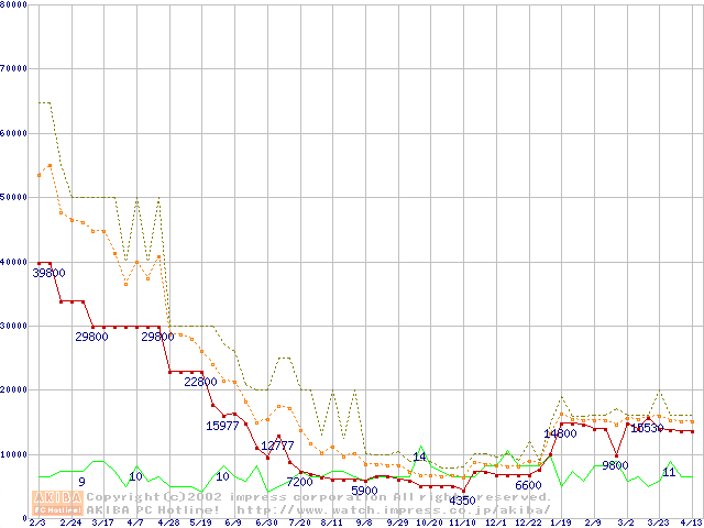 PC100 SDRAM DIMM CasLatency=2の最安値推移