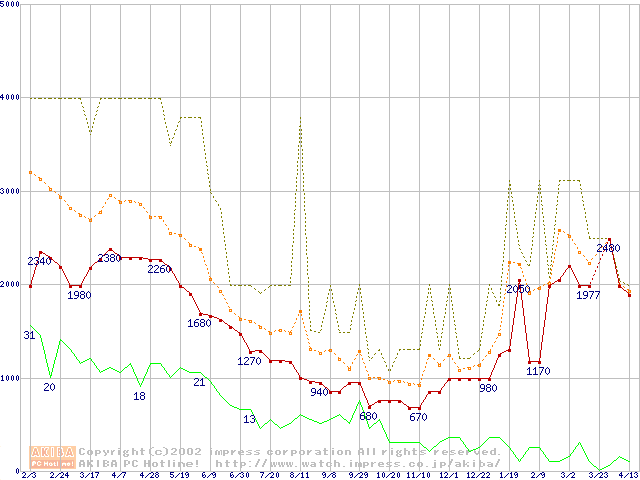 PC100 SDRAM DIMM CasLatency=2の最安値推移